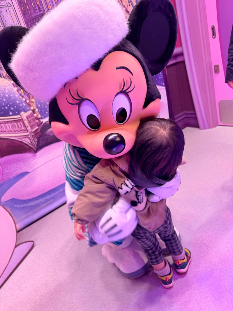息子は一目散に駆け寄り、ミニーに抱きついた。